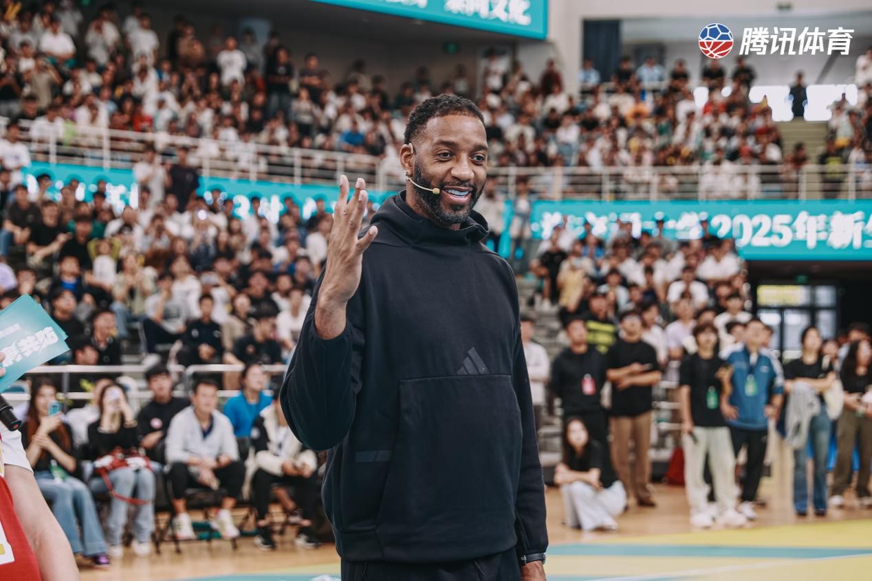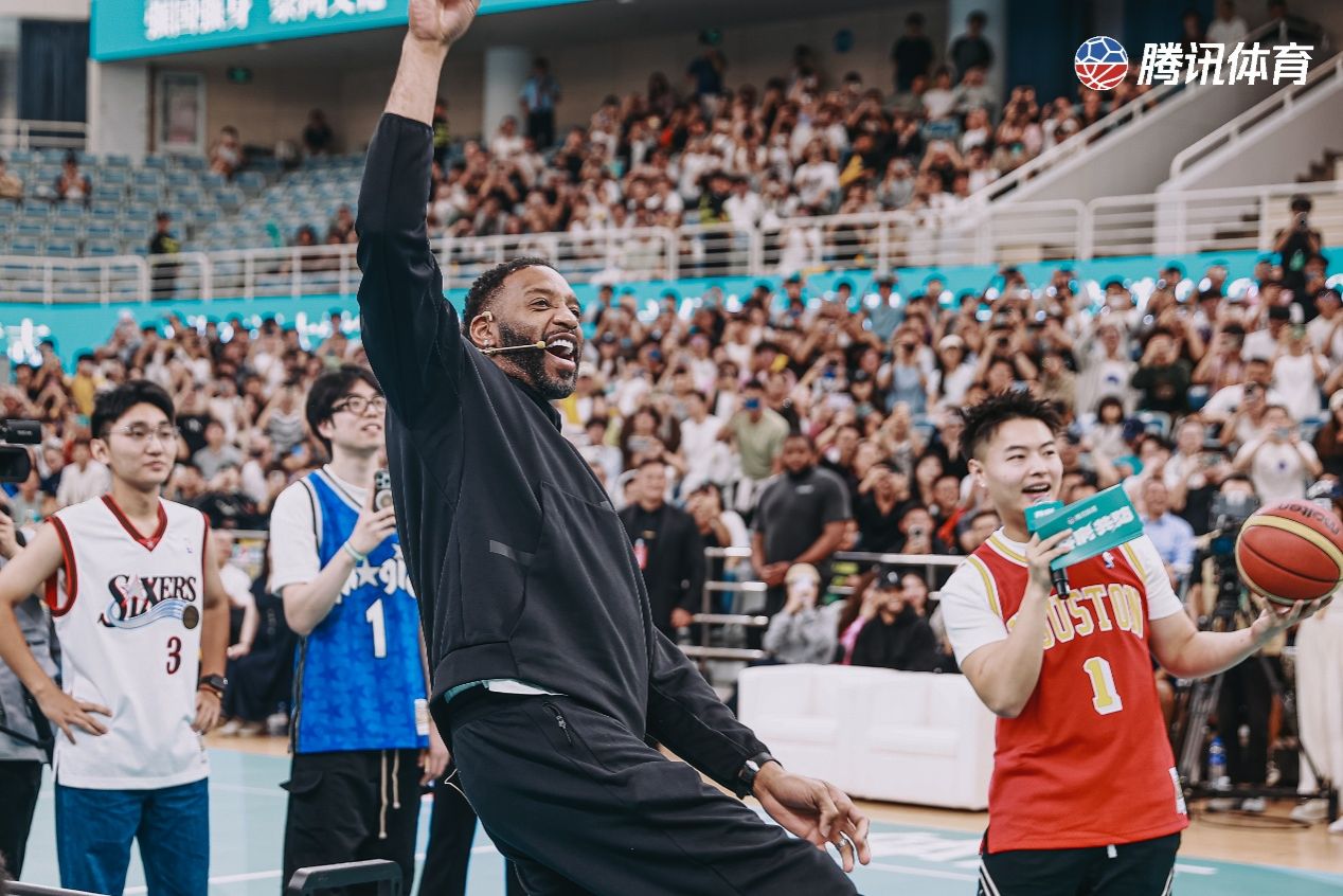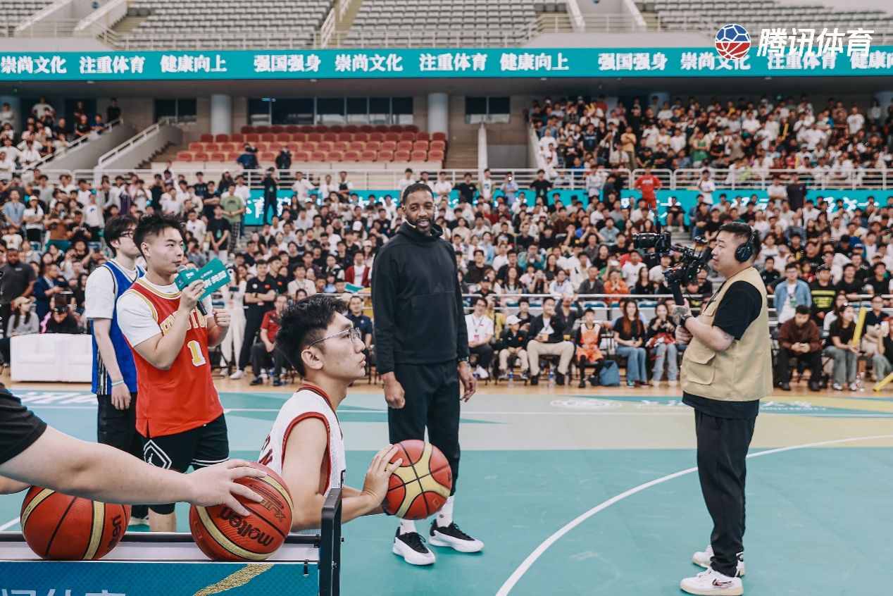 麦迪与现场师生观众共同为比赛加油助威。在互动交流环节,麦迪分享了其篮球职业生涯经验,指导现场观众代表进行60秒3分投篮比拼,并教授运球投篮技巧,现场氛围热烈,欢声笑语不断。