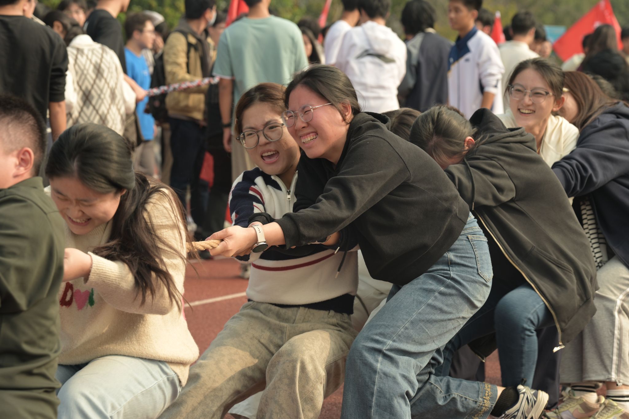 “一二、一二”,夹杂着现场此起彼伏的呐喊助威声,32个院系班级代表队参加比赛,两两对决、胜者晋级的赛制,不断地将比赛推向新的高潮。拔河运动不仅增进了同学间的感情,培养了团队合作的精神,也为同学们种下了“爱交大、爱运动”的种子。
