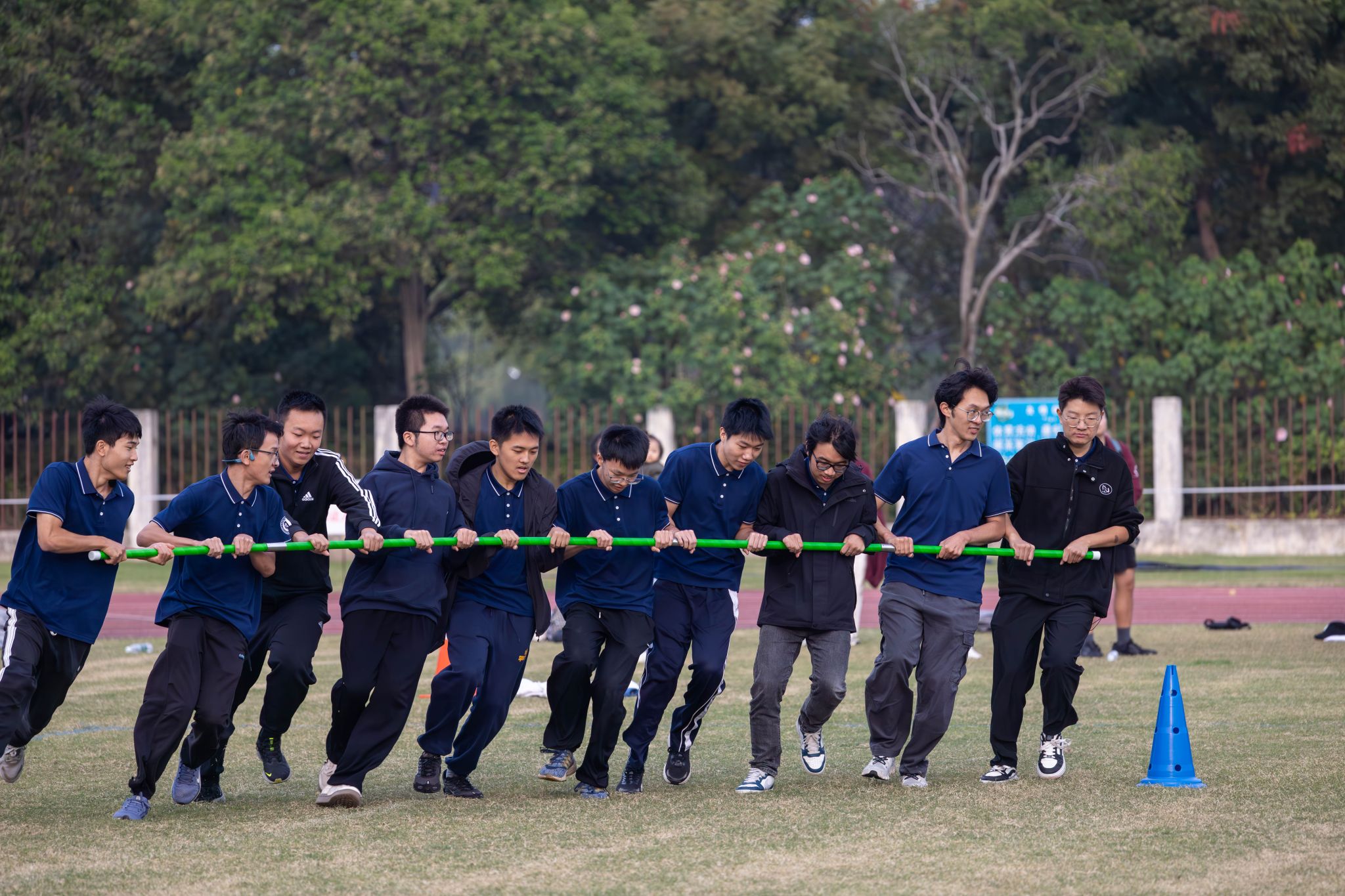“旋风跑”是今年一项新的团队竞技项目,参赛者需多人一组横向持杆协作绕桩快速折返,极具考验团队默契与爆发力。共有68支10人班级队伍报名参赛,这项运动不仅点燃了所有同学的运动热情,更有效培养了大家的协作精神。